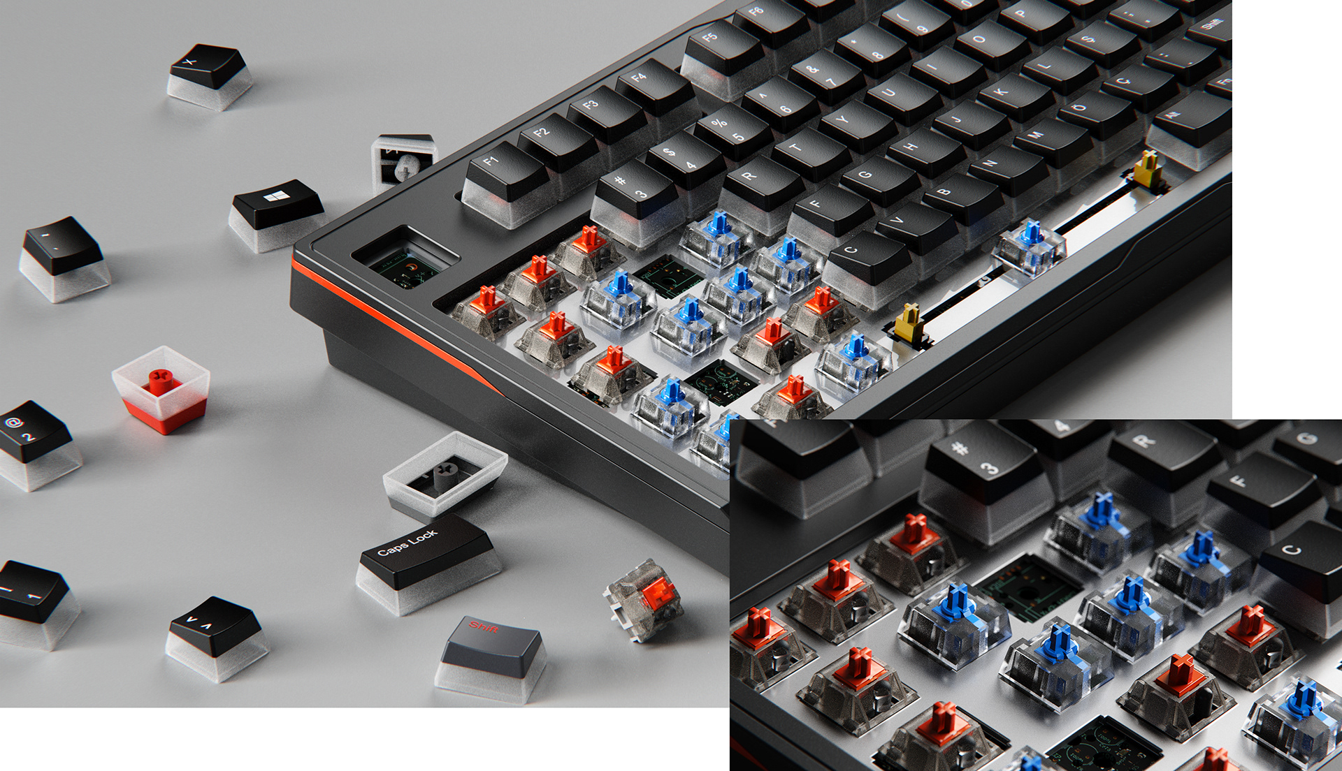 - Switch Type: Low-Profile Mechanical – Hot-Swappable (Red / Brown / Blue)